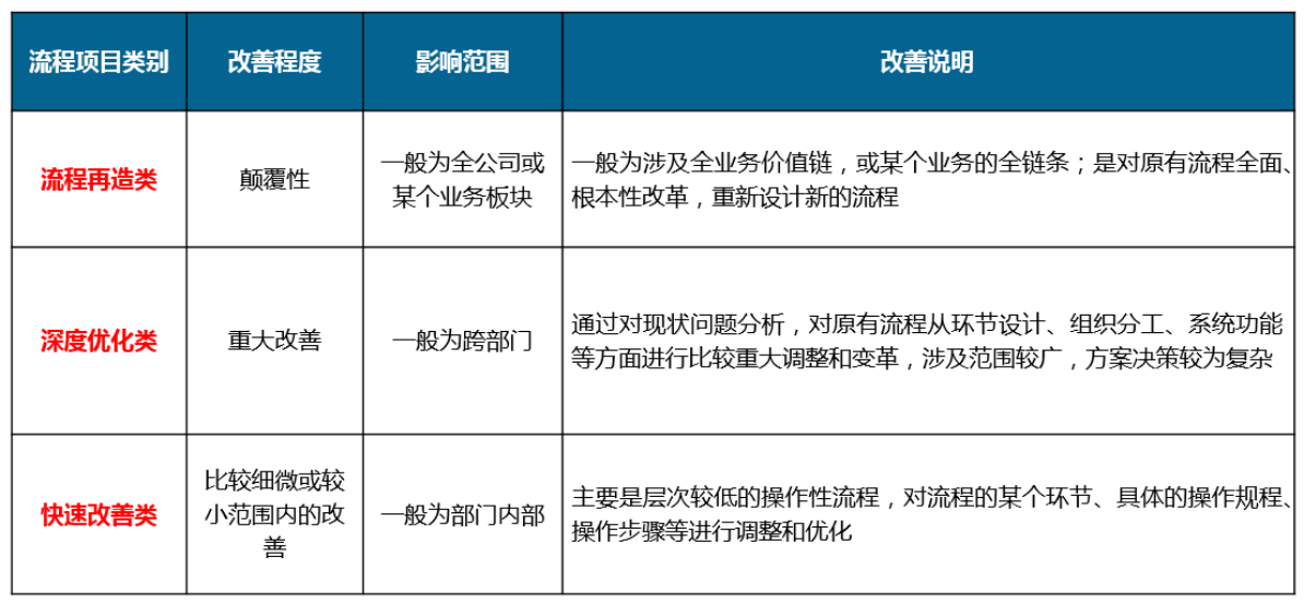 此處的流程體系建設(shè)與優(yōu)化,主要包括流程基礎(chǔ)建設(shè)、流程快速改善和部分深度優(yōu)化工作。