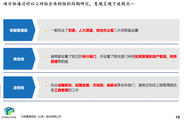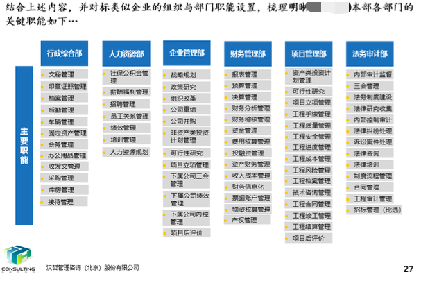 根據(jù)集團(tuán)公司的整體戰(zhàn)略目標(biāo)及公司的功能定位、業(yè)務(wù)發(fā)展需要,結(jié)合公司實際情況進(jìn)一步優(yōu)化組織架構(gòu)。通過前期的調(diào)研訪談及相關(guān)資料研讀,并對相同行業(yè)企業(yè)的組織架構(gòu)設(shè)置對標(biāo)分析,進(jìn)一步驗證現(xiàn)有11個部門設(shè)置的合理性,為實現(xiàn)公司整體戰(zhàn)略目標(biāo)夯實堅實的基礎(chǔ)。