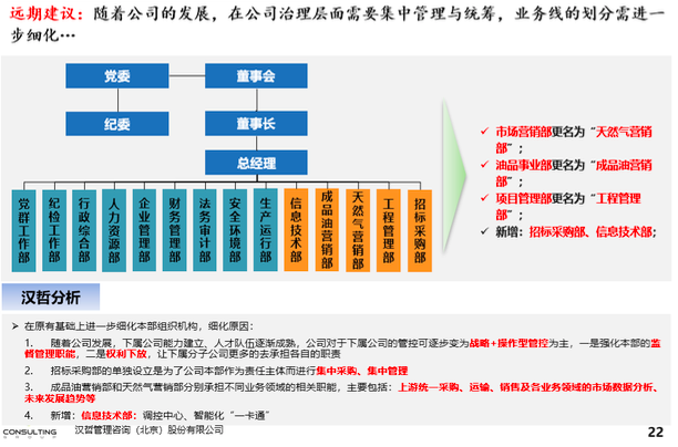 經(jīng)過前期了解,公司內(nèi)部進(jìn)行了多次的組織架構(gòu)調(diào)整,由原來的5個部門調(diào)整為11個部門,并下設(shè)22家分子公司及加氣站,各部門之間的職責(zé)分工及業(yè)務(wù)管理體系存在劃分不清、交叉、弱化等現(xiàn)象,通過對標(biāo)分析相同行業(yè)企業(yè)的組織架構(gòu)情況進(jìn)一步認(rèn)證設(shè)置11個部門是否足以支撐公司業(yè)務(wù)的未來發(fā)展。