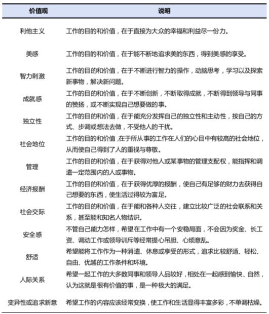 動(dòng)機(jī)是激發(fā)和維持個(gè)體的行動(dòng),并將行動(dòng)導(dǎo)向某一目標(biāo)的心理傾向或內(nèi)部驅(qū)力。通常動(dòng)機(jī)指人的興趣、意志、價(jià)值觀等。在人才測評(píng)中,常見的動(dòng)機(jī)測驗(yàn)有職業(yè)價(jià)值觀測驗(yàn)(WVI)。職業(yè)價(jià)值觀測驗(yàn)量表將職業(yè)價(jià)值分為三個(gè)維度:一是內(nèi)在價(jià)值觀,即與職業(yè)本身性質(zhì)有關(guān)的因素;二是外在價(jià)值觀,即與職業(yè)性質(zhì)有關(guān)的外部因素;三是外在報(bào)酬,共計(jì)13個(gè)因素:利他主義,美感,智力刺激,成就感,獨(dú)立性,社會(huì)地位,管理,經(jīng)濟(jì)報(bào)酬,社會(huì)交際,安全感,舒適,人際關(guān)系,變異性或追求新意。
