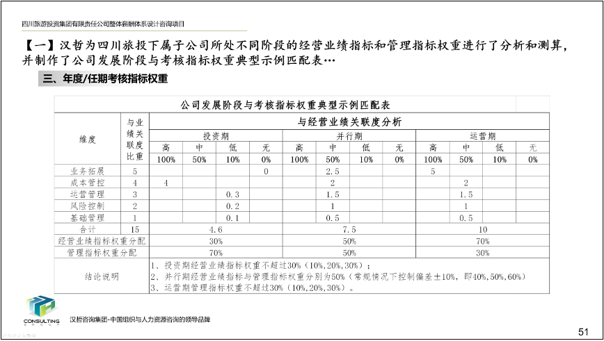 2、優(yōu)化子公司高層領(lǐng)導(dǎo)班子經(jīng)營業(yè)績考核辦法。根據(jù)各子公司的行業(yè)特點(diǎn)、業(yè)務(wù)定位和所處發(fā)展階段,擬定了子公司高層領(lǐng)導(dǎo)班子經(jīng)營業(yè)績考核指標(biāo)庫,以及相應(yīng)的指標(biāo)選擇方法和權(quán)重測算方法,確??己酥笜?biāo)符合子公司所處發(fā)展階段,提高激勵作用,保障集團(tuán)戰(zhàn)略目標(biāo)的實(shí)現(xiàn)。
