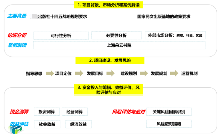 在以上背景下,出版社提出對(duì)于打造“吉云軒書苑”的可行性研究,將組建書苑項(xiàng)目的組建背景、可行性、必要性、市場(chǎng)分析、對(duì)標(biāo)分析、項(xiàng)目運(yùn)營(yíng)思路、運(yùn)營(yíng)模式、功能布局、項(xiàng)目投資、項(xiàng)目經(jīng)濟(jì)效益與社會(huì)效益分析、風(fēng)險(xiǎn)識(shí)別及應(yīng)對(duì)等方面進(jìn)行系統(tǒng)研究與分析。