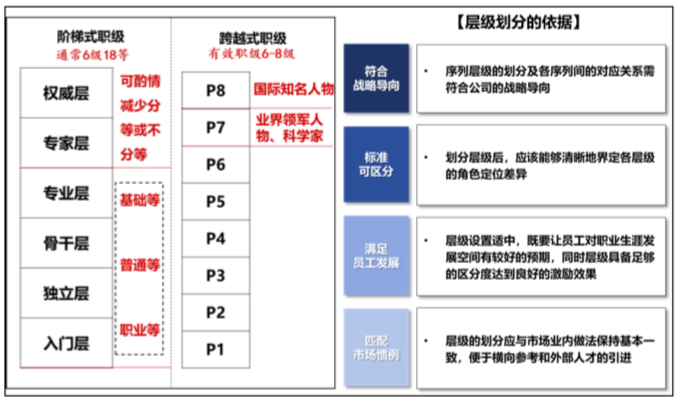當然,除參考市場經(jīng)驗外,企業(yè)還需要考慮內(nèi)部實際情況,尤其是各序列實際情況來進行層級劃分。專業(yè)壁壘、戰(zhàn)略重要性差異較大的序列在層級劃分上也會有一定區(qū)別。