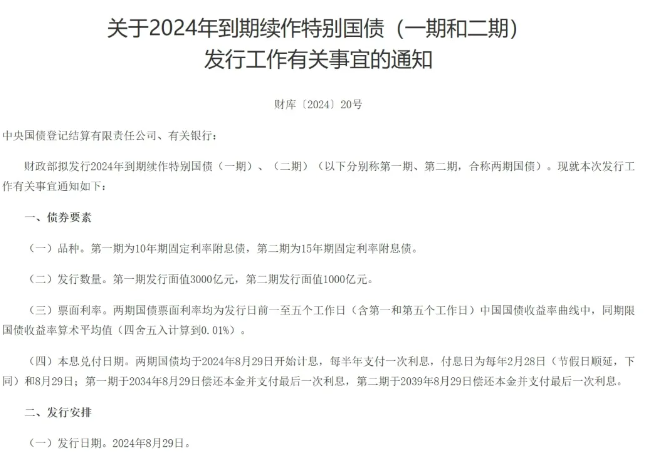 8月19日,財政部發(fā)布關(guān)于2024年到期續(xù)作特別國債發(fā)行工作有關(guān)事宜的通知。財政部擬發(fā)行2024年到期續(xù)作特別國債(一期)、(二期)。第一期為10年期固定利率附息債,第二期為15年期固定利率附息債。第一期發(fā)行面值3000億元,第二期發(fā)行面值1000億元。兩期國債票面利率均為發(fā)行日前一至五個工作日(含第一和第五個工作日)中國國債收益率曲線中,同期限國債收益率算術(shù)平均值(四舍五入計算到0.01%)。發(fā)行日期為2024年8月29日,在全國銀行間債券市場面向境內(nèi)有關(guān)銀行定向發(fā)行,中國人民銀行將面向有關(guān)銀行開展公開市場操作。