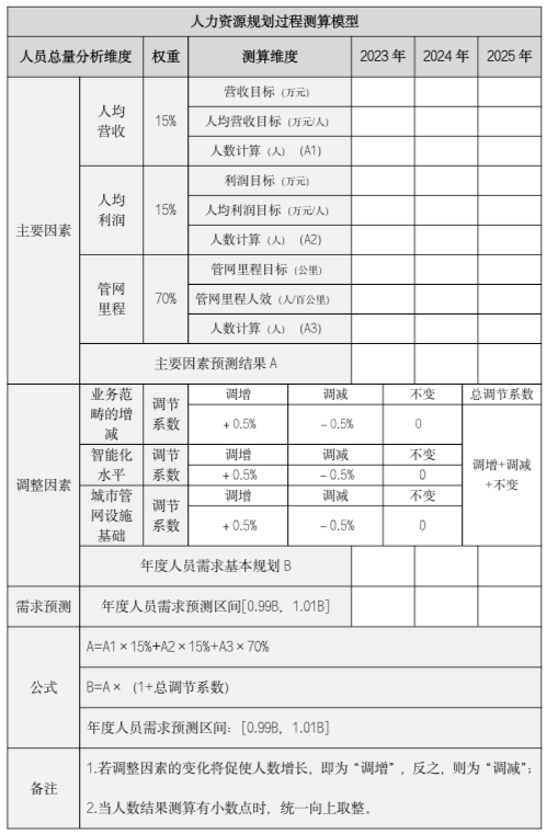 公司的人員需求規(guī)劃模型由三個主要因素和三個調(diào)整因素兩部分構(gòu)成。主要因素包括人均營收、人均利潤、管網(wǎng)里程;調(diào)整因素包括業(yè)務(wù)范疇的增減、智能化水平、城市管網(wǎng)設(shè)施基礎(chǔ)。