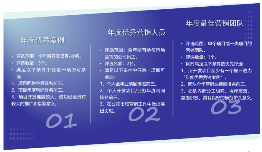 1. 精神激勵(lì)方面,精神激勵(lì)包括年度優(yōu)秀營(yíng)銷(xiāo)案例、年度優(yōu)秀營(yíng)銷(xiāo)人員、年度最佳營(yíng)銷(xiāo)團(tuán)隊(duì)三項(xiàng)榮譽(yù)。
