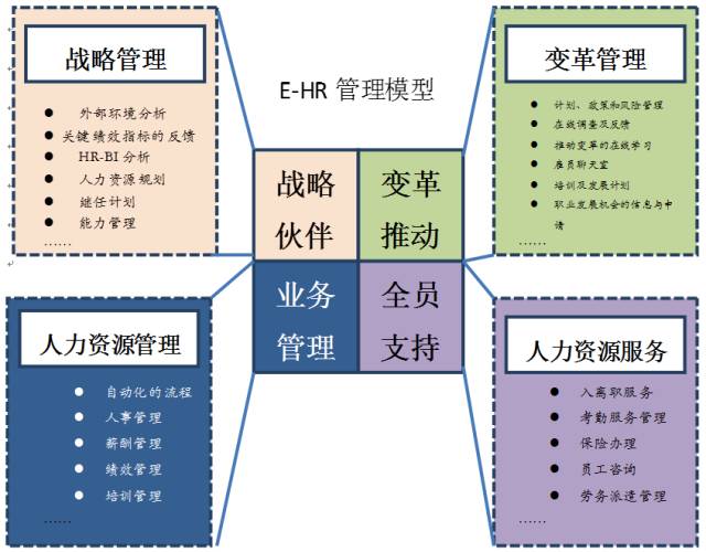 從人力資源管理信息化的價(jià)值可以看出,一個(gè)高質(zhì)量的e-HR系統(tǒng),從減少行政成本到提高人力資源的決策質(zhì)量,可以發(fā)揮不同層面的效應(yīng)。因此,構(gòu)建一個(gè)e-HR系統(tǒng),必須從多個(gè)方面同時(shí)入手進(jìn)行規(guī)劃。這里,我們引用漢哲大通提出的“人力資源管理信息化模型”來(lái)分析人力資源信息化管理的各種功能需求,模型如下圖所示: