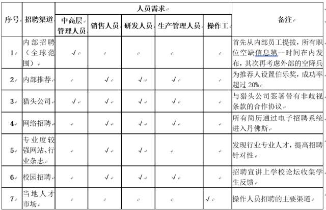 丹佛斯公司綜合運(yùn)用各種招聘渠道,根據(jù)擬聘人員的不同,靈活選用不同的招聘渠道,充分發(fā)揮了每一類招聘渠道的優(yōu)勢(shì),從而建立起最有效、最具優(yōu)勢(shì)的招聘來(lái)源。如下表所示: