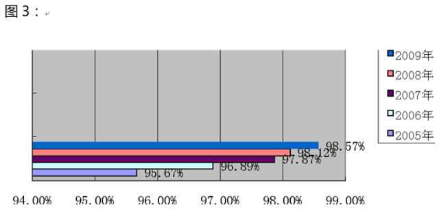 X公司產(chǎn)品質(zhì)量用“一次交檢合格率”來(lái)表示,統(tǒng)計(jì)顯示:X公司一次交檢合格率2005年為96.77%,2006年為97.52%,2007年為98.17%,2008年為98.23%,2009年為98.78%,如下圖所示。從行業(yè)來(lái)看,一次交驗(yàn)合格率高于99%屬于最高質(zhì)量水平,90-98%之間屬于高質(zhì)量水平,從近五年質(zhì)量合格率可以看出,X公司產(chǎn)品質(zhì)量處于高質(zhì)量水平,但距最高質(zhì)量水平,還有一定的差距.